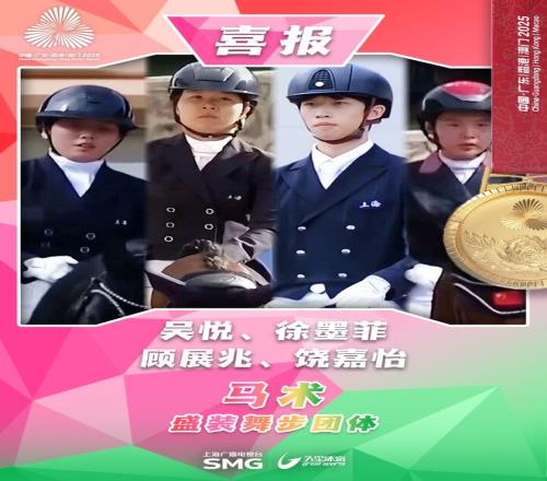 第十五届全国运动会马术盛装舞步团体决赛中,上海队的吴悦、徐墨菲、顾展兆、饶嘉怡携手以总分202.470(团体总分取最好的三人成绩相加)斩获金牌。新疆队收获银牌,广东队收获铜牌。